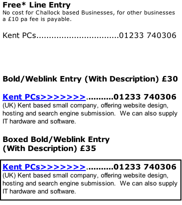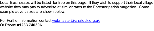 Local Business Advertising Large Advert £100  With link to your Website  (if you have one) Small Advert £55  With link to your Website (if you have one) Approximate Size of Small Advert Approximate Size of Large Advert Please Note  Your existing artwork can be used or we can design an  advert based on your current entry in the Challock Forester